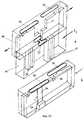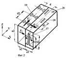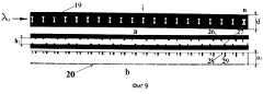 На фиг. 9 показана конструкция половины линейки ИВ канала λ2 с n поперечными ИЩ. Все поперечные ИЩ 19 имеют гантельную форму с одинаковыми размерами, кроме оконечной n-й щели, размеры которой несколько изменены (см. фиг. 9а). Индексом λ2 отмечено направление возбуждающей волны, подводимой к линейке от продольной гантельной ЗЩ 21 (см. фиг.8). На фиг. 9b показано расположение емкостных диаграмм 26 и 27 около каждой поперечной ИЩ в прямоугольном ИВ шириной b2. На фиг. 10с показаны индуктивные диафрагмы 28 и 29, располагаемые под ИЩ в прямоугольном ИВ шириной a2. Фиг. 10а иллюстрирует расположение пар емкостных 26, 27 и индуктивных 28, 29 диафрагм около поперечных гантельных ИЩ 19. Емкостные диафрагмы 26, 27 высотой A1 и A2 располагаются на противоположных широких стенках прямоугольного ИВ шириной a2 и высотой b2. Индуктивные диаграммы 28, 29 высотой h1 и h2 располагаются на нижней стенке b2 прямоугольного ИВ в плоскости емкостных диафрагм 26, 27. Размеры A1, A2 емкостных и h1, h2 индуктивных диафрагм для всех поперечных ИЩ выбираются различными с обеспечением распределения εi в соответствии с (5) и с обеспечением одностороннего согласования каждой щели по входу в соответствии с (1). Зеркальное смещение емкостных диафрагм в ИВ приводит к попеременному повороту вектора магнитного поля волны H10 относительно оси Z (см. фиг. 2) у соседних ИЩ с обеспечением синфазного возбуждения всех поперечных ИЩ (поле E'2 на фиг. 2). На фиг. 10b показан узел возбуждения в центре линейки с поперечными гантельными ИЩ через продольную гантельную щель 21, расположенную в стенке 30 между прямоугольными ИВ 25 и прямоугольными ВВ 23 (см. фиг. 3). Для согласования устройства фиг. 10b со стороны ВВ (стрелка λ2 на фиг. 10b) в плоскости расположения ЗЩ 21 вводятся индуктивные диафрагмы 31 и 32. ВВ за гантельной ЗЩ 21 имеет замыкающую стенку 33. Все углы в стыках диафрагм со стенками волноводов закруглены (радиус r=2 мм на фиг. 10) с учетом возможности изготовления ПА на фрезерных станках с программным управлением. На фиг. 11a, b показаны конструкция линейки с продольными ИЩ 18 на основе П-образного ИВ и узел возбуждения П-образного ИВ через поперечную гантельную щель 22, связывающую прямоугольный ВВ a3 • b2 (см. фиг.3) через стенку 24 с П-образным ИВ канала λ1 с размерами a1, h1 и h2 (см. фиг. 2). Стрелкой с индексом λ1 на фиг. 11а показано направление возбуждающей волны, подводимой к линейке. Около каждой продольной ИЩ 18 вводятся элементы согласования: несимметричная емкостная диаграмма 34, размещаемая на боковой поверхности металлической перегородки непосредственно под продольной ИЩ 18, несимметричная индуктивная диафрагма 35 в плоскости несимметричной емкостной диафрагмы 34 на дне П-образного ИВ, поперечный паз 36, размещаемый на верхней кромке разделительной перегородки на некотором расстоянии от продольной ИЩ 18. Размеры диафрагм 34, 35 и паза 36 выбираются различными для различных продольных ИЩ так, чтобы обеспечивалось требуемое распределение εi =const и обеспечивалось в соответствии с (1) и (4) одностороннее согласование каждой ИЩ. Для согласования узла фиг. 11а в прямоугольный ВВ с поперечной гантельной ЗЩ 22 с двух сторон от этой щели вводятся две пары несимметричных емкостных диафрагм 37 и 38, располагаемых попарно на противоположных широких стенках ВВ. За гантельной диафрагмой 22 в ВВ вводится замыкающая стенка 39. В разделительную перегородку П-образног