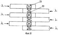 Конструктивная реализация центрального возбуждения линеек ПА каналов λ1 и λ2 проиллюстрирована на фиг. 8. Стрелками с индексами λ1 и λ2 показаны возбуждающие волноводы (ВВ), сопрягаемые с E-сумматорами 8 и 9 (см. фиг. 1) и формирующие участок 10, где в плоскости симметрии ПА располагаются поперечные гантельные запитывающие щели (ЗЩ) 22, обеспечивающие возбуждение прямоугольных ИВ канала λ1, и продольные гантельные ЗЩ 21, обеспечивающие возбуждение П-образных ИВ канала λ2. ПА из ИВ 1 и ВВ 2 (см. фиг. 1) компонуется из трех плат, стыкуемых друг с другом в плоскостях S1 и S2 (см. фиг. 3), которые совпадают с нейтралями прямоугольных волноводов шириной a2 и a3.A constructive implementation of the central excitation of the PA line arrays of channels λ1 and λ2 is illustrated in FIG. 8. The arrows with indices λ1 and λ2 show the exciting waveguides (BB), mated to the E-adders 8 and 9 (see Fig. 1) and forming the