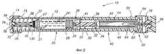 Фиг. 2 - вид в продольном разрезе устройства на фиг. 1, на котором показан шприцевой узел, помещенный в цилиндре устройства. На фиг. 2 устройство показано во взведенном положении с шприцевым узлом, полностью находящимся внутри цилиндра. FIG. 2 is a longitudinal sectional view of the device of FIG. 1, which shows a syringe unit placed in the cylinder of the device. In FIG. 2, the device is shown in cocked position with a syringe assembly completely inside the cylinder.