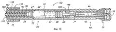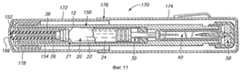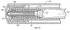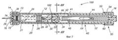 Фиг. 7 - вид с продольным разрезом устройства, сходного с устройством на фиг. 6. На фиг. 7 устройство показано в выдвинутом положении с шприцевым узлом, частично выступающим из цилиндра. FIG. 7 is a longitudinal sectional view of a device similar to the device of FIG. 6. In FIG. 7, the device is shown in an extended position with a syringe assembly partially protruding from the cylinder.