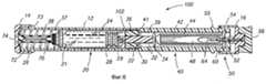 Благодаря такой конструкции перезаряжаемого инъекционного устройства 100 пользователь по выбору может ввести вторую дозу вручную без повторного взведения и заряжения устройства. Пользователь может просто вынуть шприцевой узел из устройства, снять стопорные кольца и вручную ввести лекарственное средство, используя шприцевой узел. Это очень полезно в условиях оказания неотложной помощи, когда время имеет решающее значение и не может тратиться на повторное взведение и заряжение устройства. Подобным же образом может быть открыто устройство и по варианту 10, и по варианту 100 и извлечен шприцевой узел для возможности выполнения инъекции вручную. Это может потребоваться из-за механических затруднений или по другим причинам. Due to this design of the