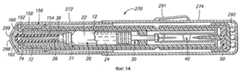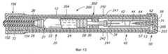 Пускатель 202 включает в себя надеваемую вручную трубку 204, которая установлена на цилиндре 12 и перемещается по нему. Трубка 202 передвигается относительно цилиндра 12 из положения неиспользования устройства или несрабатывания спускового механизма в положение использования устройства или срабатывания спускового механизма. Предпочитается, чтобы трубка 204 значительно простиралась вдоль цилиндра 12 от его проксимального конца 13 к его дистальному, дульному концу 72. Трубка предпочтительно простирается по крайней мере на 75% длины цилиндра до места, примыкающего к концевому колпачку 152. Более предпочтительно, чтобы трубка простиралась на длину, достаточную для того, чтобы соприкасаться с обращенным внутрь краем съемника 156 оболочки, кода устройство находится в заряженном, а не в использованном положении. Такое соприкосновение имеет предохранительное значение, ограничивая продольное движение трубки пускателя во взведенном положении до тех пор, пока с дульного конца инъектора не будут удалены съемник оболочки и сама оболочка. Таким образом, если даже и удален предохранитель, инъектор в большинстве случаев может быть приведен в действие только после удаления оболочки и съемник оболочки. В показанной конструкции съемник оболочки тем самым действует в качестве второго предохранителя.