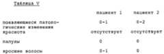 Каждый пациент дважды в день наносил состав III местно на пораженные участки. Диапазон патологических изменений кожи после лечения в течение одного месяца и в течение двух месяцев представлен в таблицах IV и V соответственно (см. в конце описания). Each patient applied composition III locally to the affected areas twice a day. The range of pathological changes in the skin after treatment for one month and for two months is presented in tables IV and V, respectively (see the end of the description).