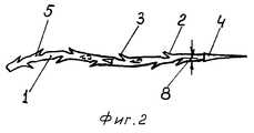 Все указанные параметры выступов и их выполнения диктуются необходимостью сохранения прочности нити на разрыв, с обеспечением упругости концов выступов и хорошего зацепления их за подкожные ткани, препятствующего обратному перемещению нити. All these parameters of the protrusions and their implementation are dictated by the need to preserve the tensile strength of the thread, ensuring the elasticity of the ends of the protrusions and their good engagement for subcutaneous tissue, preventing the reverse movement of the thread.
