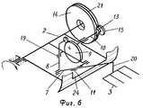 Захват 3 выполнен вилкообразным и закреплен на стержне 20 (фиг. 6), который жестко связан с концом ведомого звена 7, выходящим за пределы ротора 1. Пальцы захвата 3 расположены относительно стержня 20 под прямым углом, взаимное расположение звена 7 и стержня 20 в пространстве таково, что пальцы в рабочем положении захвата направлены нормально к поверхности ротора 1. Такая компоновка ведомого звена, стержня и захвата обеспечивает возможность свободного прохода последнего в ящик при укладке изделий и бесконтактного выхода из ящика при движении относительно ротора. Рабочее положение захвата 3 определяется положением толкателя 8 при максимальном радиус-векторе профиля кулачка 9. The