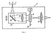 На фиг.6 изображено устройство 2 сканирования изображения источника света, которое состоит из расположенных последовательно зеркала 28, линзы 29, закрепленных на однокоординатном механизме 30 перемещения, плоскопараллельной прозрачной пластины 31, закрепленной на механизме 32 вращения, и неподвижного объектива 33. Зеркало 28 расположено так, что оптические оси падающего и отраженного от него пучков света перпендикулярны. Направление перемещения зеркала 28 и линзы 29 совпадает с направлением оптической оси падающего пучка света. Ось 34 вращения пластины 31 также параллельна оптической оси падающего пучка света. Пусть в начальном положении оптическая ось отраженного пучка света совпадает с оптической осью неподвижного объектива 33. При одновременном перемещении зеркала 28 и линзы 29 вдоль оптической оси падающего пучка света происходит смещение оптической оси отраженного пучка света в одном (на фиг.6 - горизонтальном) направлении относительно оптической оси неподвижного объектива 33. Это эквивалентно поперечному смещению источника 1 света относительно оптической оси этого объектива, поэтому его изображение также будет смещаться. Вращение плоскопараллельной прозрачной пластины 31 вокруг оси 34 приводит к дополнительному смещению оптической оси отраженного пучка света в другом (на фиг.6 - вертикальном) направлении. Регулируя величину смещения по обоим направлениям, можно реализовать любую двумерную траекторию сканирования изображения источника 1 света. Такое устройство 2 сканирования может применяться с любым источником 1 света и позволяет плавно менять его размер. Figure 6 shows a