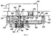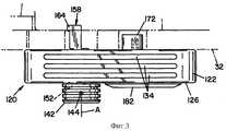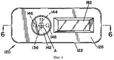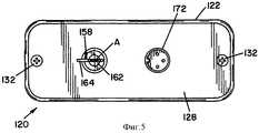 На фиг. 3, фиг. 4 и фиг. 5 показан портативный программируемый ключ 120 доступа. В соответствии с настоящим изобретением ключ 120 является портативным блоком, приспособленным для применения с замковым узлом 40 для отпирания стальных камер 12. Ключ 120, как правило, содержит прямоугольный корпус 122, который ограничивает внутреннюю, как правило, прямоугольную полость 124, которая в основном содержит механические и электрические элементы для функционального контактного взаимодействия с вышеупомянутым замковым узлом 40. Корпус 122 содержит переднюю лицевую панель 126. Съемная задняя пластина 125, лучше всего показанная на фиг. 5, прикреплена к корпусу 122 обычными крепежными средствами 132. Как лучше всего показано на фиг. 3, ряды удлиненных параллельных канавок 134 образованы вдоль продольных сторон корпуса 122. Вал 136, лучше всего показанный на фиг. 6, проходит через корпус 122 и установлен с возможностью вращения вокруг оси, обозначенной на чертежах буквой А. Маховичок 142 соединен посредством установочного винта 144 с концом вала 136, который выступает через переднюю панель 126. Маховичок 142 имеет два цилиндрических углубления 146, которые приспособлены для установки отклоняющей пружины 148 и стопорного шарика 152. Стопоры 154 образованы на наружной поверхности передней панели 126 корпуса 122 для приема стопорных шариков 152 и для ограничения определенного положения поворота маховичка 142. Силовой приводной ножевой контакт или ключ 158 присоединен к другому концу вала 136 для обеспечения возможности вращения с ним. Силовой приводной ножевой контакт 158, как правило, является плоской пластинкой, имеющей хвостовую часть 162 и приводную часть 164. В показанном варианте воплощения хвостовая часть 162 силового приводного ножевого контакта 158 установлена в пазу, образованном в торце вала 136. Штыри 166, проходящие через вал 136 и хвостовую часть 162 силового приводного ножевого контакта 158, крепят силовой приводной ножевой контакт 158 к валу 136. Втулка 168 окружает вал 136 и хвостовую часть 162, чтобы гарантировать и поддерживать соединение между ними. Приводная часть 164 имеет такие размеры профиля, чтобы быть устанавливаемой в прорези 84 цилиндра 82 замка и управляемой для вращения цилиндра при вращении маховичка 142. In FIG. 3, FIG. 4 and FIG. 5 shows a portable