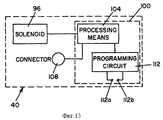 Электромеханический силовой привод 96 образует часть электронной схемы, которая схематически иллюстрируется на фиг. 13. В показанном варианте воплощения электронная схема в основном состоит из печатной платы 100, которая электрически соединена с электромеханическим силовым приводом 96 и которая содержит процессор 104. Процессор 104 содержит: 1) оперативное запоминающее устройство, предназначенное для приема и хранения данных кода доступа (то есть комбинации чисел) от внешнего источника связи; 2) устройство задержки, предназначенное для установки заданной скорости передачи данных связи между запоминающим устройством и внешним источником связи; 3) компаратор, предназначенный для сравнения данных от внешнего источника связи (то есть данных кода доступа) с данными кода доступа, хранимыми в запоминающем устройстве; и 4) управляющее средство для управления работой электромеханического силового привода 96. Соединитель 108 предусмотрен для того, чтобы дать возможность электронной схеме 100 электрически ((прим. пер.) в оригинале текста описания на английском языке, вероятно, ошибочно пропущено слово "электрически") соединяться с внешним источником связи. The