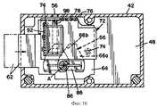 Монтажный кронштейн 92 прикреплен к внутренней поверхности крышки 44 обычными крепежными средствами 94. Монтажный кронштейн 92 имеет, как правило, C-образную форму и приспособлен для поддержания электромеханического силового привода 96. В показанном варианте воплощения электромеханический силовой привод 96 является соленоидом, имеющим цилиндрический штырь 98, выступающий из соленоида. Штырь 98 занимает положение нормального выступания, лучше всего показанное на фиг. 7 и фиг. 9, когда электромеханический силовой привод 96 не возбужден, и отведенное положение, показанное на фиг. 10, когда электромеханический силовой привод электрически возбужден. Монтажный кронштейн 92 точно устанавливает электромеханический силовой привод 96, так что штырь 98 установлен с возможностью совмещения с отверстием 78 и может пройти через отверстие 78 в язычке 76 защелки и отверстие 56 в корпусе 42 замка, как лучше всего показано на фиг. 7 и фиг. 9. The mounting