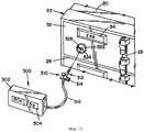 На фиг. 14 и фиг. 15 показан портативный электронный ключ 300 доступа, иллюстрирующий альтернативный вариант воплощения настоящего изобретения. Электронный ключ 300 доступа ((прим. пер.) в оригинале текста описания на английском языке, вероятно, ошибочно пропущено слово "доступа") показан вместе с предварительно описанной системой стальных камер. В этом случае компоненты системы стальных камер, аналогичные компонентам описанной выше системы стальных камер, обозначены аналогичными ссылочными номерами и не будут описываться вновь. Электронный ключ 300 доступа имеют, как правило, прямоугольный корпус 302, имеющий дисплейную панель 304. Корпус 302 содержит функциональные компоненты электронного ключа 300 доступа. Эти компоненты по конструкции и функциям будут аналогичны компонентам, описанным выше применительно к электронному ключу 120 доступа (то есть к печатной плате, содержащей процессор для осуществления предварительно описанной функции, и силовому блоку). Также как в электронном ключе 120 доступа процессор в электронном ключе 300 доступа соединен с дисплейной панелью 304 для отображения идентификационного номера открываемой стальной камеры. В отличие от электронного ключа 120 доступа, который содержит электрический соединитель 172 и отдельный механический контактный нож привода или ключ 158, электронный ключ 300 доступа содержит одни соединительный узел 310, который содержит электрический штекер 312 и ключ 314. Электрический кабель 316 соединяет штекер 312 с печатной платой в корпусе 302. Кабель 316 может быть гибким или иметь жесткий наружный коаксиальный экран. In FIG. 14 and FIG. 15 is a portable