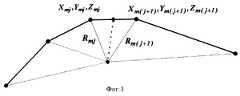 Для нахождения точки минимального расстояния сначала необходимо найти ближайший отрезок к точке с измеренными координатами xi *, yi *, zi *. Для этого необходимо путем перебора расстоянии Rmj от точки xi *, yi *, zi * до точек xmj, ymj, zmj, соответствующих концу отрезков, аппроксимирующих маршрут железной дороги (рассмотрим на примере железной дороги) и равных (см. фиг. 3)