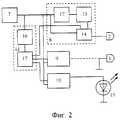 Во втором предпочтительном воплощении (фиг. 3) на выходе ключа 19 непрерывно формируются пакеты импульсов, которые поочередно подаются на выходы демультиплексора/дешифратора 20, так как разрядность счетчика 21 такова, что его состояние изменяется на 1 после каждого цикла работы формирователя 18. В остальном схема функционирует аналогично описанному выше предпочтительному воплощению, при этом выходы демультиплексора/дешифратора 20 эквивалентны выходам формирователей 8-10. В данном воплощении, параметры пакетов импульсов, поступающих на электроды 2 и 3 и на источник излучения 15 одинаковы, что в большинстве случаев приемлемо и позволяет упростить схему. In the second preferred embodiment (Fig. 3), pulse packets are continuously generated at the output of the key 19, which are alternately supplied to the outputs of the demultiplexer /