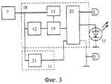 По другому предпочтительному воплощению (фиг. 3), формирователь пакетов импульсов 18 также представляет собой последовательно соединенные счетчик 12, комбинационную схему 13 и логический ключ 19 с одним управляющим входом. В формирователь 18 дополнительно введен демультиплексор/дешифратор 20, подсоединенный к выходу ключа 18. Адресные входы демультиплексора/дешифратора 20 подключены к старшим, не используемым комбинационной схемой 13, разрядам счетчика 12, которые на фиг. 2 представлены как отдельный счетчик 21, в данном предпочтении выполняющий функцию блока синхронизации 11. Источник излучения 15 может быть подключен к одному из выходов демультиплексора/дешифратора 20. Электрод 2 также подключен к одному из выходов демультиплексора/дешифратора 20. Электрод 3, по первому варианту, подключен к общему проводу, а по второму - к одному из выходов демультиплексора/дешифратора 20, не связанному с электродом 2 (показано пунктиром). Если подключение электрода 2 или 3 производится к выходу, связанному с источником излучения 15, то оно производится через токоограничительный элемент (на схеме не показан). According to another preferred embodiment (Fig. 3), the