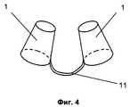 На фиг. 4 изображены два корпуса 1 носовых фильтров, связанные между собой гибкой перемычкой 11. In FIG. 4 shows two