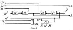 Первый выход управляемого выпрямителя 8 является вторым входом 32 управляемого выпрямителя 8. Первый и второй входы второго ключа 53 переменного тока соединены соответственно с первым и вторым выходами второго блока 55 управления. Его первый выход является третьим входом 51 управляемого выпрямителя 8, а его второй выход соединен со вторым выходом первого ключа 52 переменного тока и является вторым выходом управляемого выпрямителя 8. Первый вход первого блока 54 управления соединен с выходом операционного усилителя 56, а его второй вход соединен с шиной 19 заземления. Первый вход второго блока 55 управления соединен с шиной 19 заземления, а его второй вход соединен с выходом операционного усилителя 56, инвертирующий вход 57, неинвертирующий вход 58 которого подключены соответственно к источнику 59 напряжения смещения и к выходу логического элемента 60 ИСКЛЮЧАЮЩЕЕ ИЛИ. Первый и второй входы логического элемента 60 ИСКЛЮЧАЮЩЕЕ ИЛИ являются соответственно синхронизирующим входом 33 и управляющим входом 14 управляемого выпрямителя 8. При этом второй вход 32 выпрямителя соединен с первым его выходом. В качестве операционного усилителя 45 (фиг. 2), 56 (фиг. 4) используются общеизвестные операционные усилители (Прянишников В.Д., "Электроника: курс лекций" Спб: Корона принт, 1998 г., стр. 86, рис. 8.4б). The first output of the controlled