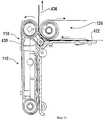 Фиг. 50 - вид спереди в плане лентопротяжных роликов, роликов отвода и ударных роликов рядом с зоной хранения, причем лист показан перемещающимся в зону хранения, как на фиг. 49. FIG. 50 is a front plan view of the tape rollers, tap rollers, and impact rollers near the storage area, the sheet being shown moving to the storage area, as in FIG. 49.