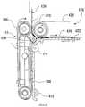 Фиг. 43 - вид механизма заслонки, показанного на фиг. 39, с документом, проходящим от сегмента периферийного механизма транспортировки в контейнерный механизм транспортировки, причем документ перемещается в направлении, противоположном показанному на фиг. 40. FIG. 43 is a view of the shutter mechanism shown in FIG. 39, with a document extending from a segment of the peripheral transport mechanism to the container transport mechanism, the document moving in the opposite direction to that shown in FIG. 40.
