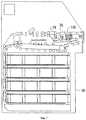 Фиг. 35 - схематичный вид, подобный представленному на фиг. 1, показывающий, как документы, ранее сохраненные в зоне депонирования, разбираются из стопки и пропускаются через центральный механизм транспортировки в автомат для хранения в зонах хранения контейнеров для хранения документов. FIG. 35 is a schematic view similar to that of FIG. 1, showing how documents previously stored in the deposit area are disassembled from a stack and passed through a central transport mechanism to a storage machine in storage areas of containers for storing documents.