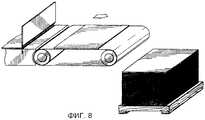 Фиг. 8 - перспектива, на которой показан непрерывный лист, который нарезают и штабелируют в виде отдельных листов. FIG. 8 is a perspective view showing a continuous sheet that is cut and stacked as separate sheets.