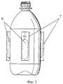 На фиг. 1 изображен сосуд в форме бутылки, на корпусе которой (на ее горловине) зафиксированы расфасованные компоненты. In FIG. 1 shows a vessel in the form of a bottle, on the body of which (at its neck) the packaged components are fixed.