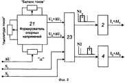 Выходные сигналы формирователя 21 опорных напряжений поступают на первый и второй входы коммутатора 23, на выходе которого формируются сдвинутые одна относительно другой по времени импульсные последовательности N1 и N2 с амплитудами импульсов U1 и U2 с пульсирующими составляющими ΔU1 и ΔU2. Импульсные последовательности N1 и N2 поступают далее на входы первого и второго источников 2 и 4 тока, которые вырабатывают токи I1+ΔI1 и I2+ΔI2, мгновенные значения которых пропорциональны амплитудам импульсов U1+ΔU1 и U2+ΔU2 (фиг. 5, 7).The output signals of the