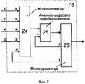 Блок 16 выполнен в виде последовательно соединенных мультиплексора 24, аналого-цифрового преобразователя 25 и микропроцессора 26. При этом первый и второй входы мультиплексора 24 являются, соответственно, первым и вторым входами блока 26 вычисления функции, третий и четвертый входы мультиплексора 26 соединены с выходами первого и второго синхронных детекторов 8 и 11, соответственно (фиг. 2).