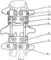 Недостатком известного устройства является то, что трудно адаптировать узлы фиксации винтов и осевые стержни между собой во время операции, узлы фиксации имеют большие размеры, не создается жесткая рамная конструкция из поперечных стяжек, что ведет к повышенной травматизации паравертебральных мышц и возможности ротационных смещений позвонков в послеоперационном периоде при боковой нестабильности. A disadvantage of the known device is that it is difficult to adapt the screw fixation nodes and axial rods to each other during surgery, the fixation nodes are large, a rigid frame structure is not created from transverse couplers, which leads to increased trauma to the paravertebral muscles and the possibility of rotational displacement of the vertebrae in the postoperative period with lateral instability.