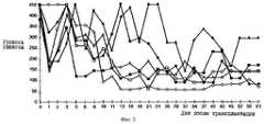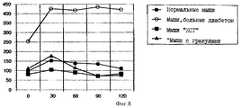 Changes in plasma glucose in the absence of starvation in C57BL / 6 mice with STZ diabetes caused by streptozotocin, observed after implantation of pancreatic islet macrobeads, are shown in FIG. 3 and 4. In recipients of agarose-collagen macrogranules with pancreatic islands coated with agarose and in recipients of macrogranules of foamy gel with pancreatic islands coated with agarose, the normoglycemic state persisted for more than 60 days, and the body weight of these mice during this period increased an average of 3 grams. When macrobeads made from agarose, with pancreatic islets and covered with agarose, were transplanted, 2 out of 6 animals acquired a normoglycemic state 21-33 days after transplantation (Fig. 5), and after that their condition remained euglycemic.