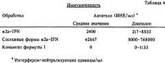 Как видно из таблицы 4, мыши, которым инъецировали α2a-IFN, вырабатывали нейтрализующие антитела, и эта реакция была сильно увеличена у мышей, которым инъецировали составные формы интерферона. У большинства животных, которым инъецировали конъюгат по настоящему изобретению, не было обнаружено антител. As can be seen from table 4, the mice injected with α2a-IFN produced neutralizing antibodies, and this reaction was greatly increased in mice injected with interferon compound forms. Most animals that were injected with the conjugate of the present invention showed no antibodies.