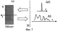 Применение импульсной характеристики рассеяния I(t) для получения одномерного изображения внутренней структуры объекта иллюстрируется фиг.7. Короткий импульс излучения I0(t) падает на рассеивающий объект 6, толщина которого существенно больше геометрической протяженности импульса. В процессе распространения этого импульса внутри объекта возникают и исчезают вторичные излучатели, соответствующие разным значением координаты z. При регистрации интенсивности обратнорассеянного излучения в некоторой плоскости 26 сигналы, соответствующие разным координатам z, приходят с запаздыванием