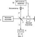 С помощью фазового модулятора вводят сдвиг частоты в опорное, объектное или рассеянное излучение. В данном примере вводят сдвиг частоты в опорное излучение 10 с помощью фазового модулятора 16. Затем опорное излучение 10 пространственно объединяют (например, с помощью светоделителя 3) с рассеянным излучением 20 и получают суммарное излучение 17. На примере, показанном на фиг.6, опорное излучение 10 пространственно фильтруют, как и рассеянное излучение, однако это необязательно и объединение опорного и рассеянного излучения в суммарное излучение может быть выполнено после пространственной фильтрации рассеянного излучения. Using a phase modulator, a frequency shift is introduced into the reference, object, or scattered radiation. In this example, a frequency shift is introduced into the