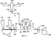 На фиг.3 представлена схема процесса получения дышащих защитных слоистых материалов данного изобретения. Согласно фиг.3 многослойную пленку 11 получают совместным экструдированием из аппарата 100, который представляет собой агрегат для получения пленок, отлитых из раствора или методом экструзии с раздувом, которые описаны выше. Обычно аппарат 100 включает два или более полимерных экструдера 102. Нерастянутую многослойную пленку 11 экструдируют на пару прижимных или охлаждающих роликов 104, один из которых может иметь форму для тиснения только что полученной многослойной пленки 11. Если речь идет о двухслойной пленке, такой как показана на фиг.1, нерастянутая многослойная пленка 11 может иметь основной вес менее чем около 100 г/м2 и более желательно основной вес около 60 г/м2.Figure 3 presents a diagram of a process for producing breathable protective layered materials of the present invention. According to figure 3, the