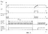 Если при движении антенна 1 устройства пересекает боковую полосу искажений фонового ЭМП, вносимого пролегающим под землей трубопроводом, то происходит появление приращение разности фаз относительно значения, принятого за фоновый уровень и скомпенсированного напряжением с выхода блока 9 коррекции. В результате этого происходит разбаланс интегратора 8 и появление на его выходе напряжения, пропорционального данному приращению разности фаз, причем величина этого приращения отражает величину интенсивности искажения ЭМП, вносимого трубопроводом в данном месте над поверхностью земли. При появлении напряжения разности фаз на выходе интегратора 8 внешний интегратор 2 начинает его интегрировать с помощью емкости блока 12 и на выходе УПТ 11 появляется напряжение, линейно нарастающее до напряжения насыщения УПТ 11, что отображается индикатором 16. Таким образом, достаточно сколь угодно малой величины разности фаз, превышающей пренебрежимо малую зону нечувствительности применяемых для реализации предварительного усилителя 3, интегратора 8 и УПТ 11 операционных усилителей, чтобы вызвать поворот стрелки индикатора 16 до предела. При этом скорость нарастания (и скорость перемещения стрелки индикатора 16) пропорциональна величины разности фаз, т.е. интенсивности искажений ЭМП, вносимых трубопроводом (фиг.3, 4). При появлении напряжения на выходе УПТ 11 и превышении им зоны нечувствительности компаратора 17, он переключается в состояние логической единицы и находится в нем до тех пор, пока напряжение на выходе УПТ 11 не достигнет напряжения насыщения (напряжения порога срабатывания компаратора 17). В момент их равенства компаратор 17 (фиг. 3, 4) переключается в состояние нуля и, таким образом, на выходе его формируется прямоугольный импульс длительностью, равной времени интегрирования внешнего интегратора 2 и обратно пропорциональной величине разности фаз. Этот импульс, инвертируясь в элементе НЕ 18, поступает с его выхода на вход вычислителя 15 и отрицательным фронтом зажигает первый зеленый светодиод 20 и запускает таймер вычислителя 15, который формирует цифровой код, соответствующий длительности этого импульса t, (т.е. величине разности фаз). После окончания импульса, что соответствует проходу над боковой полосой при перемещении устройства, код длительности запоминается вычислителем 15, а его таймер под действием отрицательного фронта импульса с выхода компаратора 17 начинает подсчитывать время паузы t1 o и сравнивает текущее его значение с установленной величиной паузы tmax o с блока 19. Если время паузы t1 o до следующего искажения поля меньше tmax o, светодиод 20 продолжает гореть. Если же за это время при перемещении устройства нового искажения поля не обнаружено (не трубопровод), при t1 o>tmax o, вычислитель 15 гасит светодиод 20 (фиг.3) и выдает сигнал единицы на сброс интегрирующей емкости интегратора 2, поступающий через элемент 13 на блок 12, и устройство автоматически возвращается в исходное состояние и готово к новому поиску (фиг.3). В случае, если в пределах установленного времени паузы t1 o<tmax o встретилось еще одно искажение поля (фиг.4), на выходе компаратора 17 появляется второй импульс, длительность которого t2 сравнивается с длительностью первого t1 и если t1>t2, то вычислитель 15 включает красный светодиод 21, что соответствует предварительному "