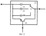 Блок 12 может быть выполнен (фиг.5) в виде набора конденсаторов 24, соединенных между собой одной обкладкой, являющейся выходом блока 12, количество конденсаторов 24 равно количеству фиксированных настроек генератора 5, каждая свободная обкладка конденсаторов 24 соединена с соответствующим неподвижным контактом переключателя 25, подвижный контакт которого является входом блока 12; блок 12 также содержит электронный ключ 26, выполненный в виде транзистора, эмиттер которого соединен с объединенными обкладками конденсаторов ТА, коллектор соединен со входом блока 12, а база является управляющим входом блока 12.