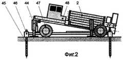 На фиг. 2 - схема установки для наклонного бурения с шасси на колесном ходу,