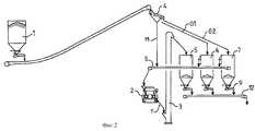 Как показано на фиг. 2-4, согласно одному примеру выполнения, сырьевой материал предварительно разделяют на фракции с различным размером зерен, так что некоторые фракции, как уже указывалось, минуют по обходному каналу всю стадию размельчения или ее часть и смешиваются с основным материалом для восполнения содержания грубых зерен, необходимых для комплектации требуемого диапазона распределения размеров зерен. As shown in FIG. 2-4, according to one exemplary embodiment, the raw material is preliminarily divided into fractions with different grain sizes, so that some fractions, as already mentioned, pass through the bypass channel the entire grinding stage or part thereof and mix with the main material to make up the content of coarse grains, necessary to complete the required range of grain size distribution.