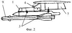 Размещение блоков 5 в пилонах позволяет значительно упростить процесс управления подвесными объектами и снизить вес летательного аппарата, а также сократить время подготовки к полету при изменении вида подвешенного объекта, т.к. для управления другим объектом достаточно заменить блок 5. Блок 5 выполняется в виде отделенного модуля и его замена предельно упрощена.The placement of blocks 5 in the pylons can significantly simplify the process of controlling suspended objects and reduce the weight of the aircraft, as well as reduce preparation time for flight when changing the type of suspended object, because to control another object, it is enough to replace block 5. Block 5 is implemented as a separate module and its replacement is extremely simplified.