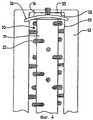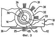 В соответствии с настоящим изобретением на каждом конце цилиндрического тела 21, 31 предусмотрен, по меньшей мере, один щетинный элемент 25, который расположен, непосредственно смежно концу цилиндрического тела, например может быть предусмотрено два таких концевых щетинных элемента, расположенных в диаметрально противоположных положениях. Отклоняющие элементы 26 предусмотрены на противоположных концах щетки 20, 30 для контактного взаимодействия с указанными концевыми щетинными элементами 25 и для отклонения их в осевом направлении наружу, когда они проходят через отверстие 13 при вращении щеток 20, 30.In accordance with the present invention, at least one