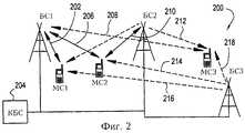 На фиг.2 показана упрощенная блок-схема примера системы 200 мобильной связи, которая может быть использована для осуществления способа 100 (фиг.1) для облегчения синхронизации (например, при наличии информации об относительных разностях во времени) БС и увеличения скорости поиска ячейки в соответствии с предпочтительным вариантом осуществления настоящего изобретения. Система 200 предпочтительно является асинхронной системой мобильной связи МДКРК, которая включает в себя, для иллюстративных целей, три БС и три МС. Однако должно быть понятно, что показанное количество БС и МС служит только для иллюстрации, и что типовая система может включать в себя более трех БС и трех МС. В этом примере МС1 работает в активном режиме, и связана через линию связи 202 интерфейса радиосвязи с БС1. В соответствии с этапом 106 способа 100 (фиг.1), МС1 принимает список соседних ячеек, предпочтительно включающий в себя соответствующие оценки ОРВ и дополнительно может связывать оценки неопределенности в заранее выделенном канале управления от БС 204 (через БС1, как только она "соединится" с МС1). По меньшей мере, две из соседних ячеек, имеющихся в списке в качестве записей в таблице оценок ОРВ, представляют собой БС2 и БС3. Систематически (или по требованию) МС1 осуществляет контроль и сообщает о качестве этих БС (мощности сигнала, ОСП, отношении сигнал-шум (ОСШ), частоте появления ошибочных битов (ЧОБ) и т.д.) в КБС 204  (через  БС1). Так как МС1 имеет принятые оценки ОРВ от КБС 204 (через БС1), МС1 может синхронизироваться относительно быстро с БС2 и БС3, по меньшей мере, первой возможности, когда МС1 осуществляет поиск БС2 и БС3. Когда МС1 синхронизирована с БС2 (или БС3), можно предположить, что МС1 имеет "хорошую" оценку ОРВ для этой БС. Систематически или по требованию МС1 может сообщать КБС 204 (через БС1) об оценке качества сигнала, соответствующей, по меньшей мере одной из записей в списке соседних ячеек. В дополнение к оценкам качества, МС1 может также передавать текущую оценку ОРВ к КБС 204.FIG. 2 shows a simplified block diagram of an example