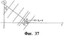 На Фиг.37 представлена диаграмма, показывающая распространение акустических волн от одного источника в двумерном пространстве на ряд распределенных в пространстве датчиков.On Fig presents a diagram showing the propagation of acoustic waves from one source in two-dimensional space to a number of sensors distributed in space.