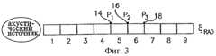 На Фиг.3 представлен иллюстрирующий концепцию пример, изображающий матричную модель передачи в виде трубы, имеющей 9 секций (или элементов, или сегментов) 1-9, акустический источник, импеданс ζrad излучения (или распространения) (ζrad=P/ρmixamixμmix), где μmix представляет акустическое возмущение; Мx=0, и где давления Р1, P2, Р3 измеряются по измерительным секциям 5-6 и 6-7. В данном примере каждый элемент имеет длину 1 метр.Figure 3 presents an example illustrating the concept, depicting a matrix model of transmission in the form of a pipe having 9 sections (or elements or segments) 1-9, an acoustic source, the impedance ζrad of radiation (or propagation) (ζrad = P / ρmix amix μmix ), where μmix represents an acoustic disturbance; Mx = 0, and where the pressures P1 , P2 , P3 are measured in measuring sections 5-6 and 6-7. In this example, each element is 1 meter long.