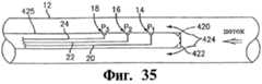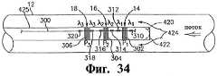 На Фиг.34 представлен вид сбоку трубы, имеющей внутреннюю трубу с распределенными вдоль оси обмотками оптических волокон датчиков нестабильного давления.On Fig presents a side view of a pipe having an inner pipe with distributed along the axis of the windings of the optical fibers of the sensors of unstable pressure.