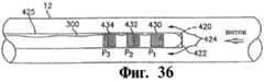На Фиг.35 представлен вид сбоку трубы, имеющей внутреннюю трубу с распределенными вдоль оси датчиками нестабильного давления, установленными вдоль трубы.Fig. 35 is a side view of a pipe having an inner pipe with unstable pressure sensors distributed along the axis mounted along the pipe.