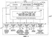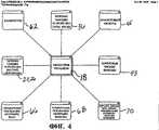 На фигуре 6 схематично представлен обмен информацией между различными внешними подключениями и интерфейсами и поток информации внутри устройства регистрации, получаемой на основе измеряемых значений, команд пользователя, обработанных и записанных данных и выходных сигналов, генерируемых устройством регистрации. Измеренные аналоговые значения, такие как напряжения, токи и аналоговые значения от термопар и РИТ, установленных в аналоговых модулях 45, обрабатывают в модуле 80 обработки измеренных значений и передают в модуль 82. Цифровые входные сигналы, такие как логические уровни напряжения в портах 43, обрабатывают в модуле 84 и передают в виде цифровых значений в модуль 84. Аналогично цифровые выходные значения, такие как сигналы реле, передают из модуля 82 в модуль 84, где их преобразуют для формирования цифровых выходных сигналов в цифровых портах 43 входа/выхода. Модуль 82 также принимает входные сигналы и формирует выходные сигналы через модуль 86 входа и выхода внешней передачи данных, который соединен через модуль 88 последовательного сообщения и драйверы 90 интерфейса с универсальным интерфейсом 66, стандартным интерфейсом 68 и интерфейсом 70 коммуникационной шины.The figure 6 schematically shows the exchange of information between various external connections and interfaces and the flow of information inside the registration device, obtained on the basis of measured values, user commands, processed and recorded data and output signals generated by the registration device. Measured analog values, such as voltages, currents, and analog values from thermocouples and RHSs installed in