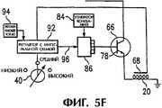 фиг.5Е - схематическая иллюстрация выходного контура с устройством ручного управления в виде выключателей, с помощью которого может быть установлен высокий, средний и низкий температурный режим, обеспечиваемый сообщением соответствующих импульсов транзистору большой мощности при соответствующих импульсных отношениях при подаче напряжения или тока от этого транзистора к нагревательному элементу;Fig. 5E is a schematic illustration of an output circuit with a manual control device in the form of switches, with which a high, medium, and low temperature mode can be set, which is provided by communicating the corresponding pulses to a high power transistor with corresponding pulse ratios when applying voltage or current from this transistor to heating element;