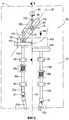 Ползун 424 имеет на переднем конце ролик 425, работающий по кулачку, который прилегает к фасонной кромке 426 дискового кулачка 423. Ползун 424 может скользить внутри направляющей 427, закрепленной вдоль продольной центральной линии 24 основного шасси 18. Гидравлический цилиндр 428 закреплен на заднем конце ползуна 424. Трубки 422 и 421 проходят вперед от цилиндра 420 и соединены соответственно со штоковой и поршневой полостями цилиндра 428.The