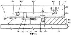 На фиг.15 показаны шарниры 100 и 101, выступающие вверх из рам 106 и 107 через прорези 152 и 153 к соединительным элементам 110 и 111. Дополнительное шасси 33 прикреплено к основному шасси 32 через посредство плиты 154, снабженной поворотным круглым подшипником 155, расположенным ниже. На фиг.15 шарниры 102 и 103 закрыты, но они закреплены на основании элемента 156, который сам прикреплен к плите 154. Соединительные элементы 110 и 111 проходят через прорези 157 с гарантированным зазором в конструкции дополнительного шасси 33. Шарниры 413а и 413b подсистемы 410 показаны выступающими вверх от дополнительного шасси 33 через прорези 158.On Fig shows the
