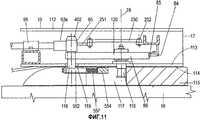 V-образный соединительный элемент 415 находится на заднем конце ползуна 417, который может скользить в направляющей 418, закрепленной на продольной центральной линии 24 основного шасси 18. Гидравлический цилиндр 420 присоединен между передним концом ползуна 417 и соединительным элементом 419, закрепленным на продольной центральной линии основного шасси 18. Когда ползун 417 перемещается вперед, жидкость из поршневой полости цилиндра 420 закачивается в трубку 421, а жидкость из трубки 422 вытягивается в штоковую полость цилиндра 420. Обратное происходит тогда, когда ползун 417 перемещается назад.A V-shaped connecting