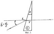 Угол отклонения луча δ от первоначального направления после преломления в клине (фиг.3) определяется известным соотношением [2]. δ=θ(n-1), где δ выбирается равным.The angle of deviation of the beam δ from the original direction after refraction in the wedge (figure 3) is determined by the known relation [2]. δ = θ (n-1), where δ is chosen equal to .