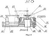 Одновременно с вращением щетки 26 и пластины 12 подаются соответствующие растворы, которые затем попадают в ванну 21 и удаляются через сливное отверстие 48. После очистки пластины 12 щеткой 26 щетка отводится в исходное положение механизмами 24, 25. А вместо щетки 26 над поверхностью пластины 12 устанавливается форсунка 27, размещенная на кронштейне 28 (фиг.4) с возможностью перемещения в вертикальной плоскости с помощью механизма 29 и по горизонтали с помощью механизма 30 и установленная на том же корпусе 23 ванны, что и щетка 26. Через форсунку 27 подают деионизованную воду или раствор, озвученные мегазвуком. При этом форсунка 27 начинает сканирование от центра пластины 12 до ее периферии с помощью механизма 30. После окончания мегазвуковой очистки форсунка 27 отводится в исходное положение механизмами 29, 30. Столик 20 с пластиной продолжает вращение от привода 22 на больших оборотах. Пластина высушивается, и центрифуга останавливается, вакуум отключается, конус 46 опускается.Simultaneously with the rotation of the